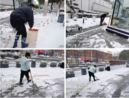 凜冽寒風(fēng)中,室外溫度跌破冰點(diǎn),路面積雪清理難度大。但這絲毫沒有阻擋大家的熱情——項(xiàng)目人員與物業(yè)服務(wù)團(tuán)隊(duì)迅速集結(jié),手持掃帚、鐵鍬等工具,分工明確、默契協(xié)作。有的彎腰揮鍬,奮力鏟除路面厚冰;有的手持掃帚,細(xì)致清掃殘余積雪。忙碌的身影在皚皚白雪中穿梭,勞動(dòng)的汗水浸濕衣衫,卻讓這個(gè)寒冷的冬日格外溫暖。