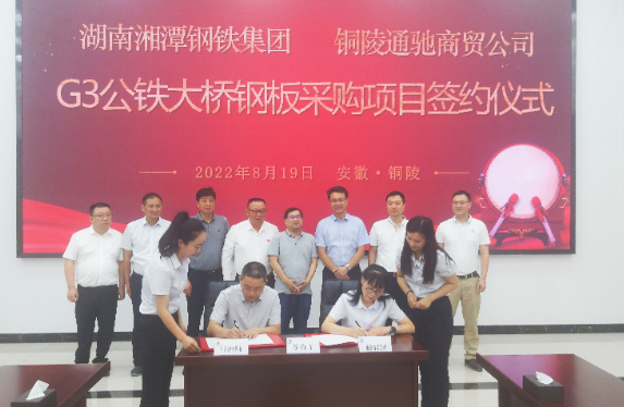8月19日上午,集團(tuán)公司黨委副書記、總經(jīng)理周文勝在G3銅陵長(zhǎng)江公鐵大橋項(xiàng)目部會(huì)見湘鋼集團(tuán)黨委書記、執(zhí)行董事、總經(jīng)理?xiàng)罱ㄈA一行。雙方就鋼板材料、物流服務(wù)等方面開展深入交流,并共同見證湘鋼集團(tuán)與市交投集團(tuán)司屬通馳商貿(mào)公司簽訂G3銅陵長(zhǎng)江公鐵大橋鋼板采購(gòu)項(xiàng)目合作協(xié)議。中鐵大橋局G3銅陵長(zhǎng)江公鐵大橋項(xiàng)目部經(jīng)理劉幸福及集團(tuán)公司黨委委員、副總經(jīng)理范美霞、湯世才,總工程師張葉來出席簽約活動(dòng)。