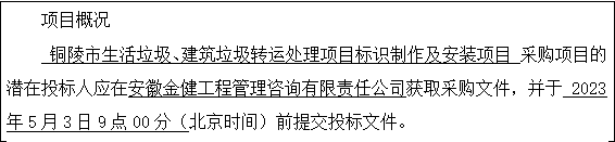 采購(gòu)需求:銅陵市生活垃圾、建筑垃圾轉(zhuǎn)運(yùn)處理項(xiàng)目標(biāo)識(shí)制作及安裝項(xiàng)目,詳見(jiàn)招標(biāo)文件項(xiàng)目需求內(nèi)容。