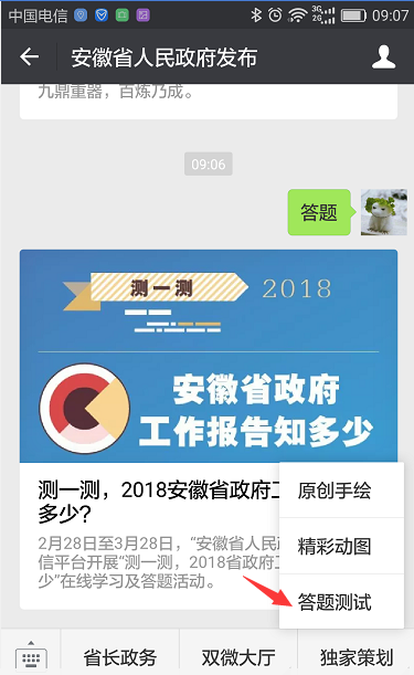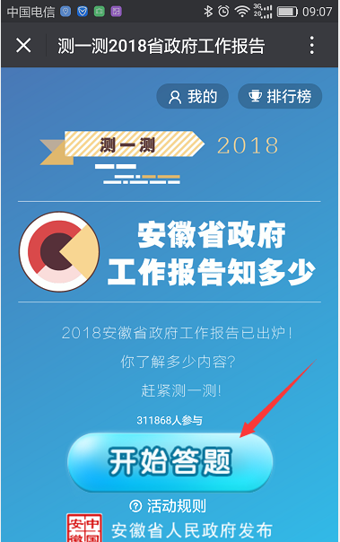 根據(jù)市政府辦公室文件通知要求,扎實(shí)做好2018省政府工作報(bào)告學(xué)習(xí)貫徹工作,定于2月28日至3月28日,通過“安徽省人民政府發(fā)布”微信平臺(tái)開展“測(cè)一測(cè),2018省政府工作報(bào)告知多少”在線學(xué)習(xí)及答題活動(dòng)。