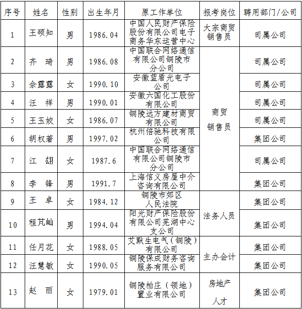根據《銅陵市綜合交通投資集團有限公司招聘人員公告》,現(xiàn)將相關崗位擬聘用人員名單公示如下: